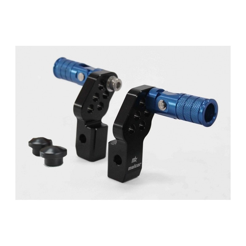 Estriberas multiregulables V2, retrasadas y elevadas todo en un solo producto. Fabricadas en cnc azul por MALCOR. Alta calidad con acabado cnc. Nuevos estribos color azul moviles con tapon embellecedor. Hasta 6 posiciones diferentes.
