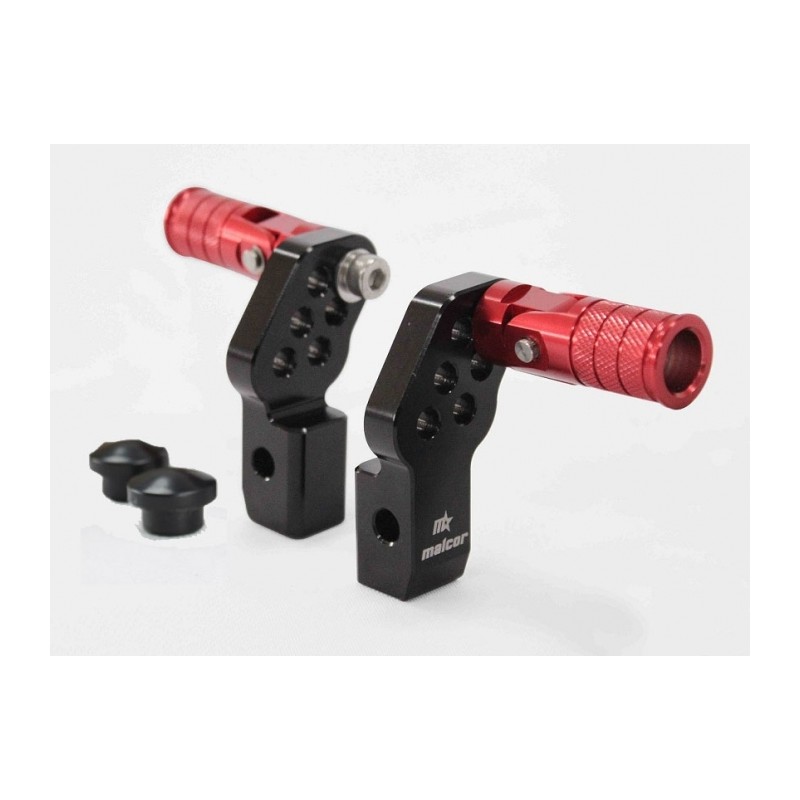 Estriberas multiregulables V2, retrasadas y elevadas todo en un solo producto. Fabricadas en cnc rojas por MALCOR. Alta calidad con acabado cnc. Estribos color rojo moviles con tapon embellecedor. Hasta 6 posiciones diferentes.