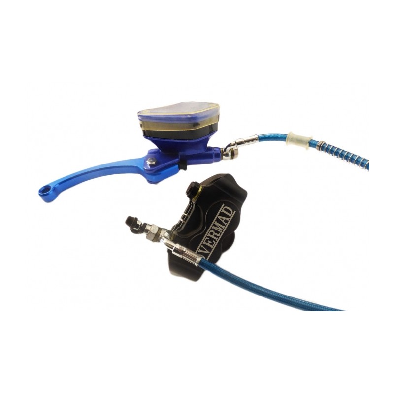 Freno completo radial compuesto de latiguillo trenzado metalico azul en acero inoxidable, pinza radial de 4 pistones dorada o negra y bombin de presion piston 17mm