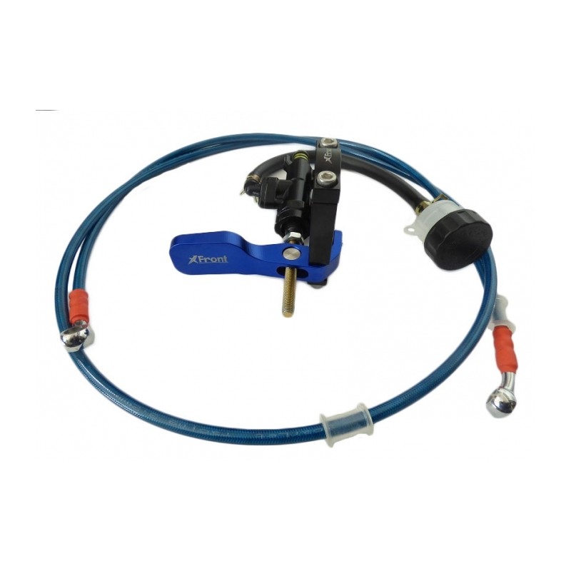 Freno trasero de pulgar para pit bikes, con leva azul anonizada. Desarrollado por malcor en la competición. Ahora incluimos latiguillo de freno de 1650mm de longitud.