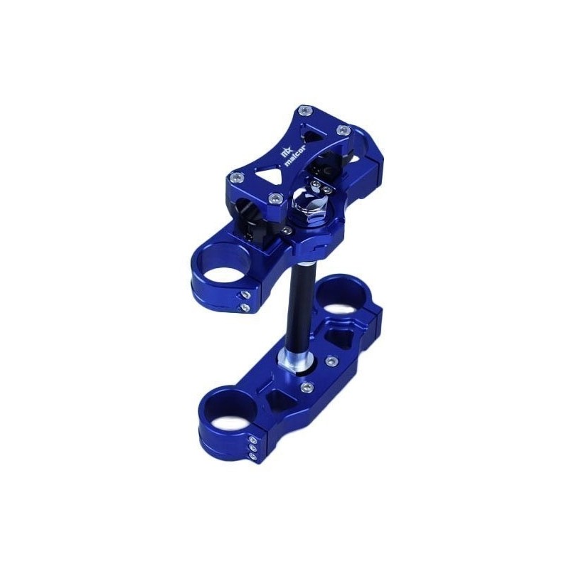 Tijas MALCOR fabricadas en CNC con regulacion de eje variable en avance y retroceso para pit bikes anonizadas en color azul. Tijas altisima calidad aluminio 6061. Tijas para manillar de 28mm, horquillas de 45/48 y con anchura de 177mm.