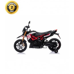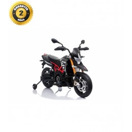 Moto electrica replica de la original APRILIA DORSODURO 900cc. Con insignia de la marca original y ruedines incluidos. 2 motores de 18w cada uno marcha atrás. Incluye led de control con MP3 y usb en el manillar.